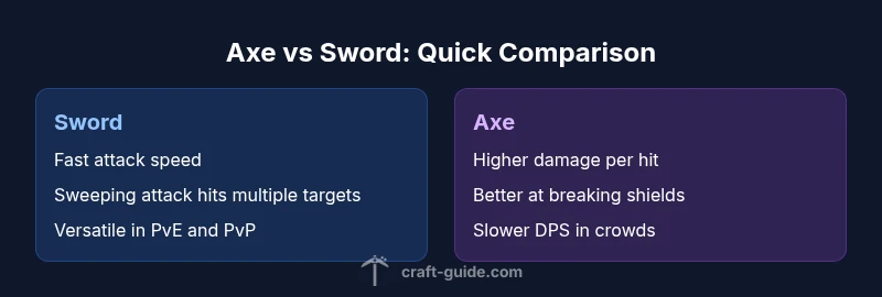 In the world of Minecraft, your weapon choice—axe vs sword minecraft—shapes every encounter. The core dynamic is tempo: swords emphasize speed and precision, while axes emphasize raw impact and deliberate timing. According to Craft Guide, understanding these trade-offs starts with recognizing the battlefield demands: mobs converge quickly, blocks are around you, and you must balance offense with defense. The sword’s fast attack cadence lets you chain hits and apply rapid pressure, which is especially valuable when mobs swarm or you need to conserve health during a long chase. On the other hand, the axe offers heavier hits that can intimidate a single target or finish a tough foe with fewer swaps. This analysis delves into when each tool shines, and how to adapt your playstyle as resources and threats evolve. The axe vs sword minecraft debate is not about absolute power, but about matching your strategy to terrain, armor, and group dynamics.