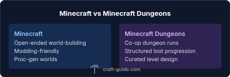 The difference between minecraft and minecraft dungeons becomes clear when you compare scope, goals, and playstyles across both titles. Craft Guide aims to unpack these distinctions without bias. Minecraft is a sandbox that invites endless world-building, redstone creativity, and extensive modding opportunities. Minecraft Dungeons, by contrast, is a linear-leaning, dungeon-crawling adventure built around cooperative play, enemy variety, and loot loops. This section sets the stage by defining each game's core identity and the expected player experience. You’ll notice how the two share branding and a common universe, but diverge sharply in structure, progression, and day-to-day play.