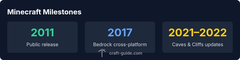 Minecraft’s timeline starts with its 2011 public release, followed by a steady cadence of updates and platform expansions. The Java Edition became the anchor for modding and community-driven content, while the Bedrock Edition emerged to unify cross-platform play across Windows 10, consoles, and mobile. Over the years, major milestones included cross-platform collaboration, the introduction of new biomes and mobs, and annual celebrations that spotlight the game’s longevity. For new players, the 2011 start date is less important than the ongoing availability of fresh content and robust community tools. Craft Guide Analysis, 2026 shows that the core engine has adapted without losing its original spirit, which is why the game remains appealing after more than a decade.