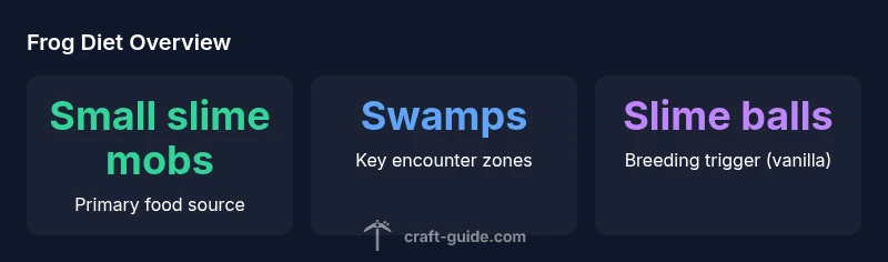 Frogs in Minecraft primarily eat small slimes that spawn in swamps and other damp biomes. This simple diet ties frogs to the slime ecosystem and helps explain their feeding behavior in survival and creative modes. According to Craft Guide, understanding this tiny diet is key to breeding frogs and predicting their in-game interactions.
