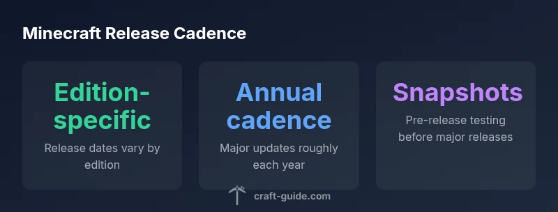 Minecraft exists in multiple editions, and each has its own release history. Java Edition releases are tied to significant updates via Mojang's open development process, while Bedrock Edition follows a separate timeline that has expanded across Windows 10, consoles, and mobile. As a result, a feature may debut on Java first and arrive later on Bedrock, or come to Bedrock in parallel depending on platform goals. The Craft Guide team notes that this separation means players on different devices may experience different dates for the same feature. If you want a clear sense of timing, focus on the edition you play and track the official patch notes for that edition.