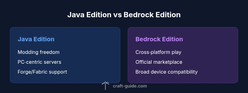 Java Edition is the preferred choice for modding, custom maps, and deep world-building on PC. Bedrock Edition shines for cross‑platform play, performance on lower-end devices, and smoother multiplayer with friends on consoles and mobile. If you plan to mod heavily or build complex redstone worlds, choose Java; if you want broad device compatibility and quick multiplayer, choose Bedrock. Craft Guide analyses this split to help you decide.