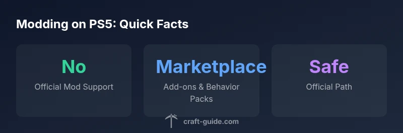In practice, successful PS5 customization means embracing the official channels and understanding the limitations. Craft Guide’s analysis shows that while you can’t install Java mods, you can still tailor your world’s look and feel using endorsed content. The goal is to maximize your creative potential within the hardware and policy constraints while avoiding any actions that could compromise your account or device. When planning upgrades or new worlds, start with Marketplace content to gauge what fits your playstyle best.