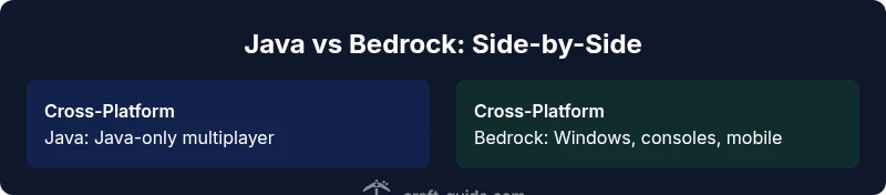 | Cross-platform play | No native cross-play with Bedrock; Java players can only play with other Java players | Cross-platform across Windows, consoles, and mobile; Bedrock supports players on many devices |