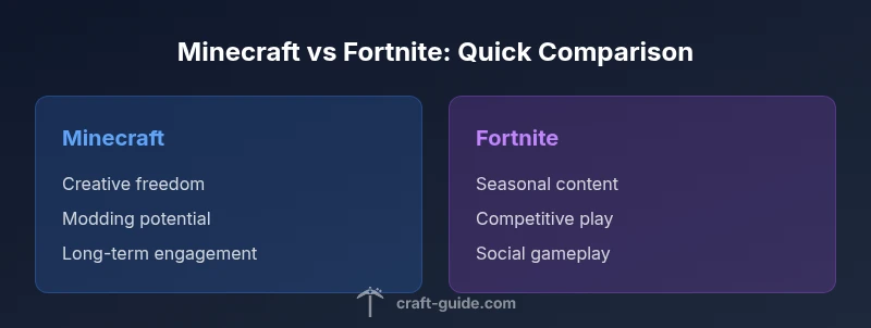 According to Craft Guide, evaluating whether is minecraft better than fortnite requires looking beyond surface polish to core gameplay, accessibility, and long-term value. This comparison does not rely on hype; it centers on how the games reward creativity, skill-building, and ongoing engagement. The Craft Guide team found that most players arrive for different reasons: some seek a creative canvas, others seek structured competition. By the end, you should be able to map your own preferences to concrete player journeys in each title. The question is not which game is objectively superior, but which one better aligns with your goals, friends, and available time. In this article, we quantify the differences across gameplay, progression, community, and economics, so you can make an informed decision.