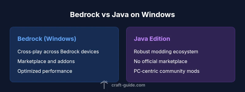 mediaPipeline":{"heroTask":{"stockQuery":"Windows PC gaming desk with Minecraft screen","overlayTitle":"Edition Showdown on Windows","badgeText":"2026 Guide","overlayTheme":"dark"},"infographicTask":{"type":"comparison","htmlContent":"<div class="w-[800px] p-8 bg-slate-900 text-white"><h3 class="text-2xl font-bold text-center mb-4">Bedrock vs Java on Windows</h3><div class="grid grid-cols-2 gap-6"><div class="p-6 bg-blue-500/20 rounded-xl border border-blue-500/30"><h4 class="text-xl font-bold text-blue-400 mb-4">Bedrock (Windows)</h4><ul class="space-y-2"><li>Cross‑play across Bedrock devices</li><li>Marketplace and add‑ons</li><li>Optimized performance</li></ul></div><div class="p-6 bg-purple-500/20 rounded-xl border border-purple-500/30"><h4 class="text-xl font-bold text-purple-400 mb-4">Java Edition</h4><ul class="space-y-2"><li>Robust modding ecosystem</li><li>PC‑centric with no official marketplace</li><li>Community‑driven content</li></ul></div></div></div>","altText":"Infographic comparing Bedrock and Java on Windows","caption":"Bedrock vs Java: Key differences at a glance"}},