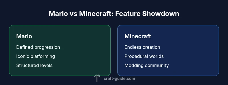 mario vs minecraft sits at the crossroads of two long-running gaming philosophies: tight, level-driven platforming and expansive, player-driven creation. According to Craft Guide, these franchises appeal to different audiences and sensibilities, yet they often surface in conversations about game design, accessibility, and community participation. For newcomers, the contrast can be distilled to a simple question: do you want a curated adventure that guides you through levels, or do you crave a vast canvas where rules are flexible and goals are self-set? Both games have endured because they align with enduring player desires—challenge and control on one side, imagination and collaboration on the other. This article maintains an analytical, reader-first approach to help you weigh your preferences and choose your path with confidence.