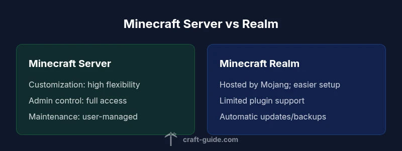According to Craft Guide Analysis, 2026, a Minecraft server and a Realm are both multiplayer environments, but they target different player needs. A server is a flexible piece of software that runs on your hardware or a hosting provider, granting you control over configurations, plugin support, world settings, and admin tools. Realms, by contrast, are a managed, hosted option provided by Mojang that aims to simplify uptime, automatic backups, and cross-device access for small groups. Realms are edition-specific (Java or Bedrock) and come with a predictable, fixed feature set. This distinction matters because it influences customization, maintenance effort, and long-term scalability. Craft Guide emphasizes that your decision should hinge on group size, desired level of control, and anticipated growth.