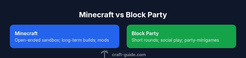 According to Craft Guide, the difference between minecraft and block party hinges on scope, pace, and intent. Minecraft is a broad, open-ended sandbox where players build, explore, and adapt to survival or creative rules. Block Party represents a class of party-style mini-games hosted on multiplayer servers, emphasizing short rounds, button presses, jumping puzzles, and rapid social interaction. In practice, many players experience both styles: they design sprawling worlds in Creative or Survival, then jump into Block Party sessions to enjoy quick, competitive moments with friends. This section clarifies terminology and sets expectations for the deeper analysis that follows. For newcomers, the core distinction is that Minecraft rewards long-term projects, while Block Party rewards fast decision-making and teamwork in repeated rounds.