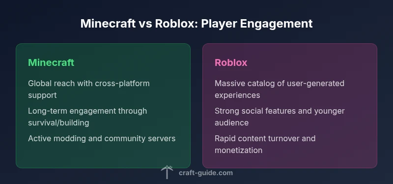 In 2026, Roblox generally leads in sheer reach among younger audiences, while Minecraft sustains deeper engagement per active player through survival, building, and modding. When we compare “how many people play Minecraft compared to Roblox,” the clearer takeaway is that Roblox drives broader participation, but Minecraft often delivers longer, more persistent play sessions for dedicated builders and modders. Craft Guide’s analysis emphasizes that the best comparison depends on which activity you value: broad reach or long-term engagement.