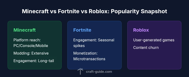 When we compare Minecraft to top peers like Fortnite and Roblox, several contrasts emerge. Fortnite often dominates in seasonal events and fast-paced interaction, delivering spike-like engagement. Roblox thrives on user-generated content and rapid content turnover within a shared ecosystem. Minecraft, by contrast, emphasizes long-tail engagement through mods, servers, and community-built worlds. Together, these dynamics create a diversified popularity landscape where all three titles maintain strong presence, but for different reasons and time horizons. The Craft Guide team emphasizes that popularity is not a single metric but a tapestry of engagement signals that evolve with platform policies, community norms, and developer support.