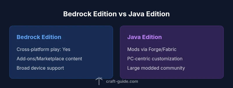 Minecraft Bedrock Edition and Java Edition are two official builds of the same core game, designed to serve different audiences and hardware ecosystems. Bedrock Edition runs on Windows 10/11, consoles (PlayStation, Xbox, Nintendo Switch), and mobile devices, and it uses a cross‑platform multiplayer model. Java Edition, by contrast, is PC‑native and built on Java; it emphasizes moddability, world customization, and the year‑to‑year evolution of the Java codebase. According to Craft Guide, the two editions emerged from different design goals: Bedrock to maximize reach and consistency across devices, Java to empower power users with a flexible, mod-friendly environment. For players deciding where to start, understanding these foundations helps you pick an edition that matches your devices, play habits, and aspirations. In this guide, we dissect the core differences, benefits, and tradeoffs in a clear, practical way.