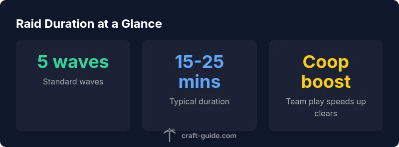 Raids last no fixed timer; their duration depends on wave progression and player defense. In typical play, most raids resolve in about 15-25 minutes, but the exact length varies with village size, mob composition, and teamwork. Preparation, terrain use, and rapid mob elimination can shorten the encounter, while complex setups may stretch it toward the upper end.