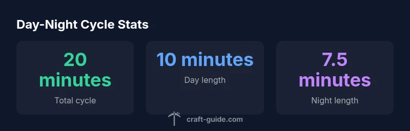 Night lasts about 7.5 minutes of real time, within Minecraft’s 20-minute day-night cycle. Daytime runs for around 10 minutes, and sunrise and sunset each span roughly 1 minute 15 seconds. Real-time length can vary slightly from server latency or world settings. According to Craft Guide analysis, these timings are consistent across Java and Bedrock editions, with minor drift on busy servers.