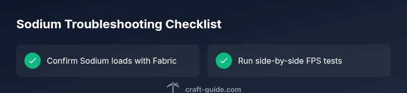According to Craft Guide, Sodium is a rendering optimization mod designed to improve frame pacing and reduce rendering latency by streamlining how blocks and lighting are processed. It focuses on the core rendering pipeline, delivering smoother motion without sacrificing visual quality. If you’re asking how to know if sodium is working minecraft, you’re in the right place: this guide walks you through concrete tests and checks to confirm its active status and impact. In practice, Sodium should help maintain higher and more stable frame rates on a wide range of GPUs, especially in dense biomes or large builds where rendering load spikes. The goal is not to chase impossibly high FPS but to achieve consistent, predictable performance under your preferred settings and world size. Craft Guide’s analysis suggests that even modest hardware can benefit from Sodium when paired with a compatible mod environment.