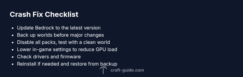 If you're wondering how to stop minecraft bedrock from crashing, understanding common causes helps you target fixes quickly. According to Craft Guide, the most frequent culprits are outdated game builds, corrupted world data, and incompatible add-ons or resource packs. Hardware or driver issues, such as older GPU drivers or insufficient RAM, also trigger crashes across Windows, consoles, and mobile. In many cases, a crash appears at startup or during a heavy render scene, which signals either software version gaps or data conflicts. Recognizing whether the crash is tied to a particular world, a specific pack, or a recent update helps you narrow the fixes without wasting time. Throughout this guide you’ll see practical tests, from quick wins to detailed reinstall steps. The goal is stability without sacrificing your progress. Craft Guide’s analysis shows that most crashes are solvable with careful, repeatable steps and verified backups.