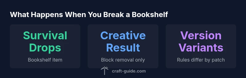 If you're curious about what happens when you break a bookshelf minecraft, the answer depends on mode and version. According to Craft Guide, understanding bookshelf mechanics helps players optimize resources. In most Survival worlds, breaking the block will drop the bookshelf item so you can place it again or use it for decoration, and you may also harvest books indirectly through related farming methods. In Creative mode, breaking a bookshelf simply removes the block with no resource loss. The Craft Guide Team emphasizes that exact behavior can shift with patches, so always check current patch notes for your edition. This section outlines typical outcomes, how they affect your builds, and practical tips to recover resources. The keyword drives practical exploration for builders who want to plan efficient libraries and aesthetic shelves.