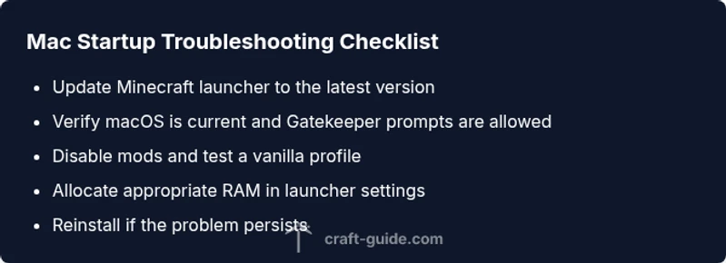 Verify macOS version, available disk space, and that the launcher is the official Mojang version. Make sure the Mac is not in sleep mode during startup prompts and that you can launch other apps to confirm system health.