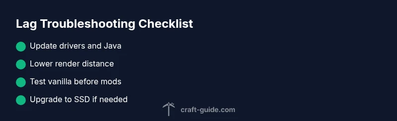 To prevent lag, keep drivers updated, back up saves, and run periodic system cleanups. Schedule a monthly check of disk health and a quarterly review of mod compatibility. If lag persists after thorough testing and hardware checks, consider professional diagnostics or hardware upgrades, especially for aging machines. The Craft Guide team recommends documenting changes so you can revert if a tweak worsens performance.