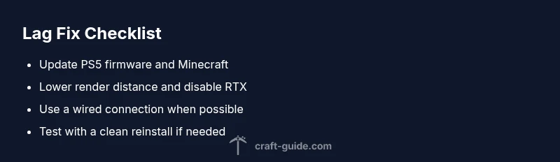 Lag on PS5 is rarely caused by a single issue. The question why is minecraft so laggy on ps5 often points to a mix of software, hardware, and network factors. According to Craft Guide, console performance is especially sensitive to game version, installed resource packs, and background processes. In practice, the most common culprits are outdated software, high render distances, and suboptimal network conditions. The PS5's solid hardware should handle modern builds, but Minecraft on console has unique constraints (world loading, chunk rendering, and texture streaming) that can spike CPU and GPU usage, resulting in visible stutter, teleporting mobs, or long world loads. Understanding these interactions helps you diagnose issues faster and apply targeted fixes rather than random tinkering. By approaching lag as a system problem rather than a single setting, players can make incremental improvements that compound over time, preserving both performance and a smooth gameplay experience for friends in survival and creative modes.
