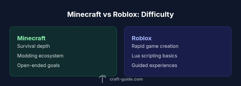 When we compare how hard Minecraft is relative to Roblox, the answer depends on what you value: survival realism, coding, building scope, or how quickly you can publish a game. If you ask 'is minecraft harder than roblox', the answer depends on your goals and learning style. For a novice, Roblox’s guided experiences and user-friendly scripting with Roblox Studio can feel approachable, while Minecraft demands navigation of resource scarcity, health, hunger, and tool durability. The Craft Guide Team has found that player perception of difficulty often aligns with goals: builders face different obstacles than explorers, and coders encounter entirely separate challenges.