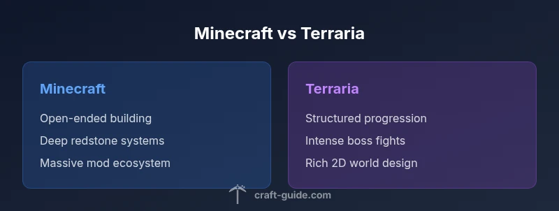 If you’ve ever googled is minecraft or terraria better, you’re asking for a decision that hinges on playstyle, time horizon, and personal preference. The Craft Guide team found that the most reliable way to answer this question is to assess core mechanics, progression curves, and community ecosystems rather than chase a single “winner.” This section sets the stage by outlining what each game fundamentally emphasizes: Minecraft prioritizes open-ended creation, automation, and exploration, while Terraria emphasizes structured progression, tight combat pacing, and rich 2D world design. By understanding these core theses, players can map their own priorities to concrete criteria such as building depth, challenge curves, and modding potential. This framing helps transform a vague curiosity into a concrete, actionable choice that matches your preferred vibe, whether you want sprawling megacomplexes, or a well-tuned boss progression with meaningful loot. Craft Guide’s analyses emphasize practical decision factors and real-world player experiences, ensuring you don’t get lost in memes or hype when answering is minecraft or terraria better for you.